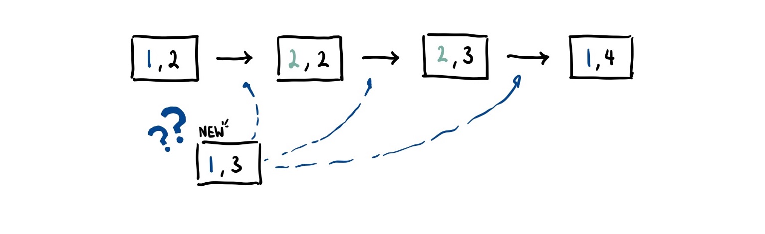 Every time we insert an element into the list, we need to know the ID of the character we are inserting after. Then, we just place it somewhere between that element and the element following it.