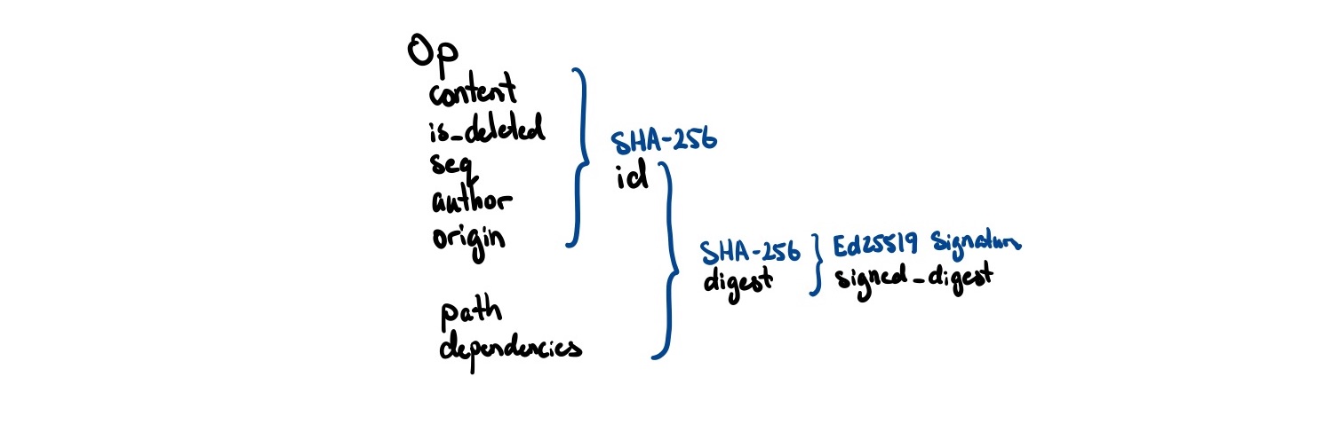 Instead of making a copy of the original operation and just changing the content (which would cause the operation to be considered invalid by our hash check!), we can produce an entirely new operation that has the original ID as a causal dependency. These ‘modification’ operations don’t actually get included in the internal representation of the CRDT, rather they modify it directly.