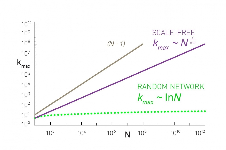 Once hubs are present, they change the way we navigate the network. In random networks, we usually need to make many hops. On scale-free networks, however, we can reach most destinations via a single hub. Scale-free networks mean that even as the sizes may differ widely between networks, navigation time across the networks is very slow to grow (ultra-small world network).