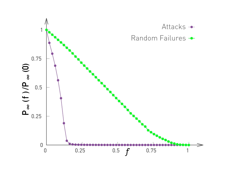 The probability that a node belongs to the largest connected component in a scale-free network under attack (purple) and under random failures (green).