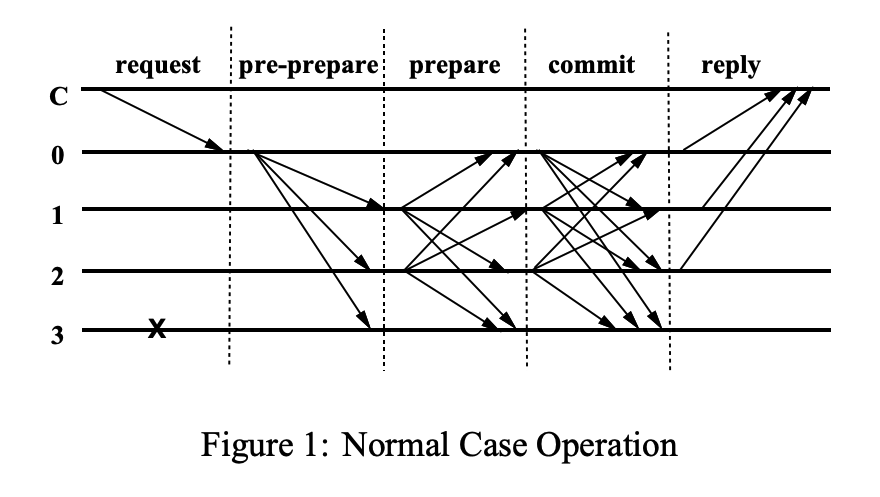 - If the client doesn’t receive replies in a timely manner, it broadcasts the request to all replicas. If the request has already been processed, the replicas simply re-send the reply (as replicas cache the last reply sent to each client)