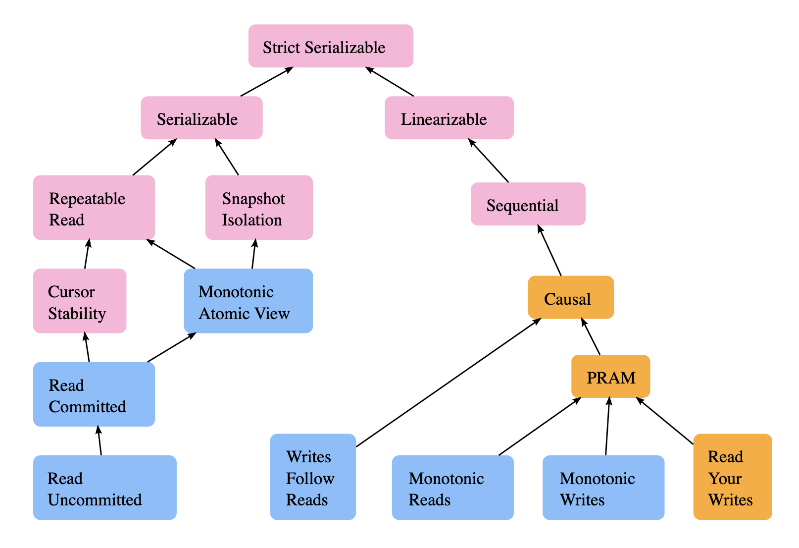 Strictly equivalent to the combination of the above Read your writes, Monotonic reads and Monotonic writes