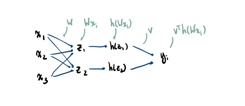 Parameters: the (k,d) matrix , and (k) vector . To turn this into multi-class classification, we modify into a (k’, k) matrix (where k’ is the number of classes) and convert to probabilities by computing the softmax of the values