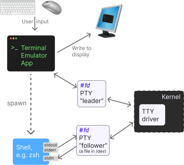 - The terminal emulator then spawns the shell which reads and writes from the follower PTY (the shell’s